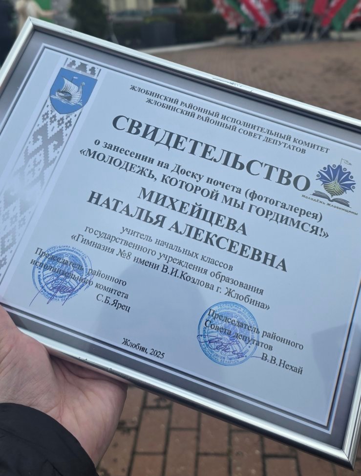 🎉Поздравляем Михейцеву Наталью Алексеевну, учителя начальных классов государственного учреждения образования “Гимназия №8 имени В.И.Козлова г.Жлобина” с занесением в фотогалерею на Доску почета “Молодежь, которой мы гордимся!”💪 Гордимся! 🫶Желаем дальнейших Побед и достижений!🔥