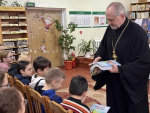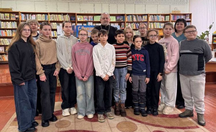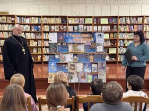 В стенах библиотеки ребята встретились с настоятелем прихода храма Преподобного Серафима Саровского, отцом Леонидом.