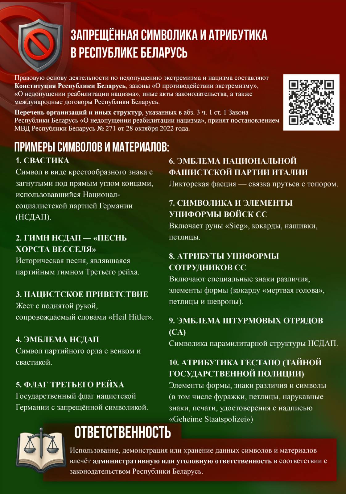 Информация об ответственности за распространение информации экстремистского содержания, а также список экстремистских материалов размещен в свободном доступе в сети Интернет по адресу http://mininform.gov.by/documents/respublikanskiy-spisok-ekstremistskikhmaterialov/.